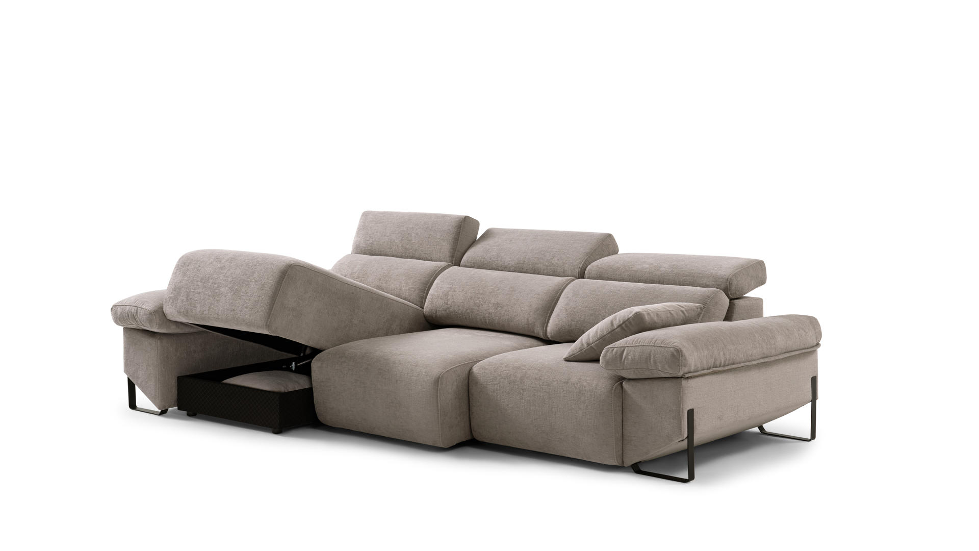 CHAISE-LONGUE ARCÓN, un espacio de almacenaje oculto y de apertura manual situado en el módulo chaise-longue, con una gran capacidad.